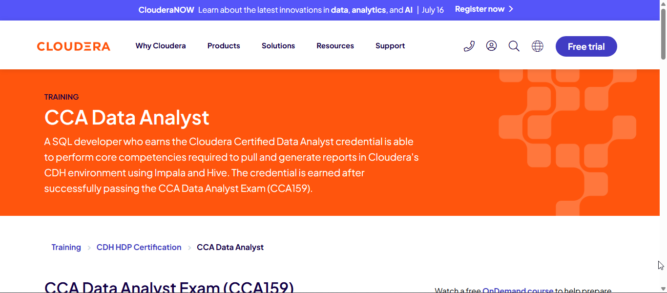 The CCA Data Analyst certification is geared toward professionals with strong SQL skills working in big data environments. It focuses on querying, transforming, and analysing data using Apache Hive and Impala within the Cloudera ecosystem.