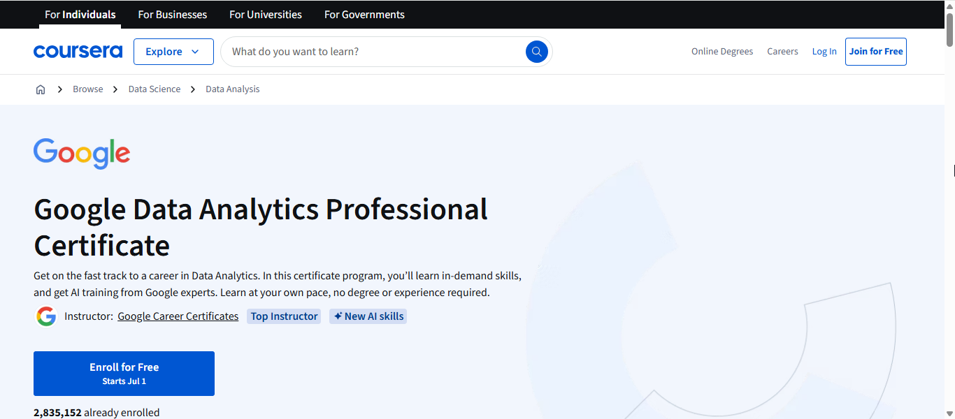 Offered through Coursera, this beginner-friendly certification is designed for career changers or those just starting in analytics. Over six months, learners cover data cleaning, analysis, visualisation, spreadsheets, R programming, and SQL, all while building a portfolio of real-world projects.