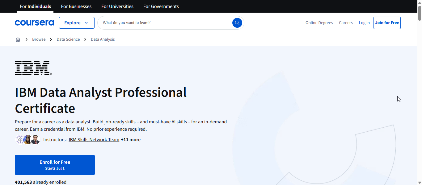 Like the Google certificate, it’s available for $59/month, and can be completed in 3 to 6 months, depending on your pace. IBM’s strong brand name and the practical nature of the coursework make this a smart launchpad into analytics.