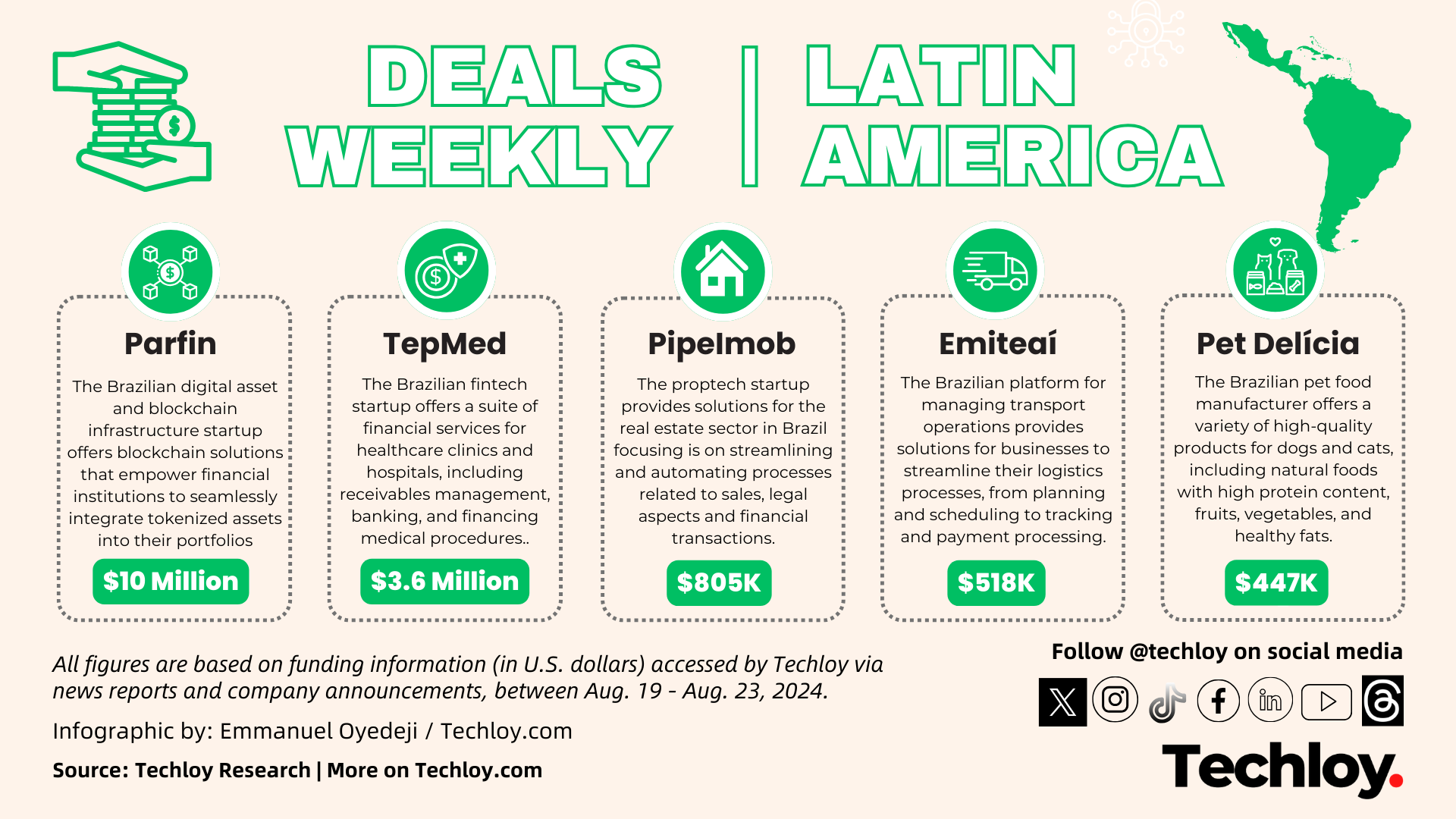 These are the funding deals we tracked in the LatAm region this week including Parfin, Tepmed, PipeImob, Emiteaí, and Pet Delícia