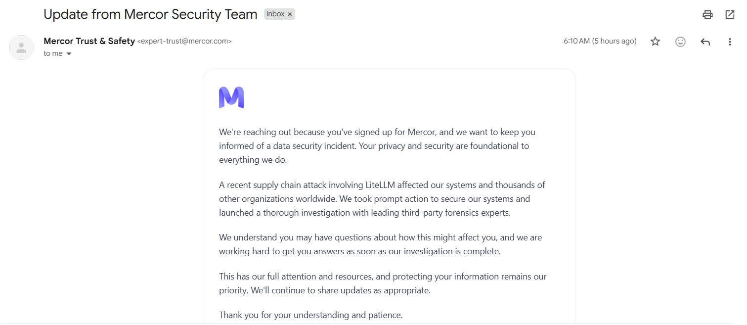 “A recent supply chain attack involving LiteLLM affected our systems and thousands of other organizations worldwide,” the company said. “We took prompt action to secure our systems and launched a thorough investigation with leading third-party forensics experts.”