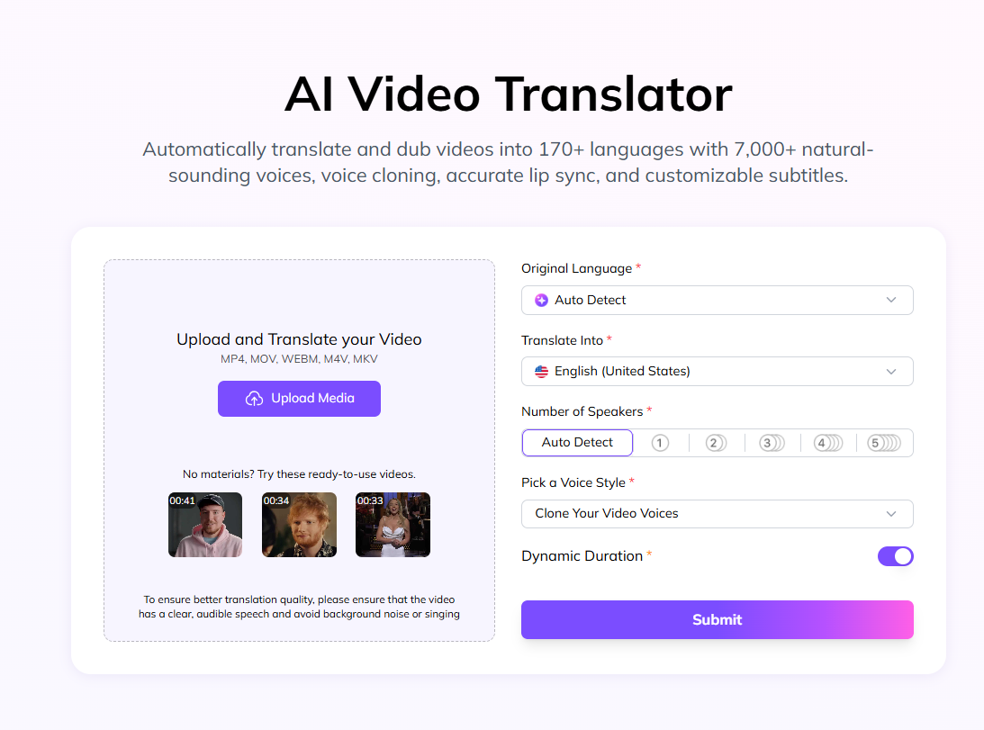 Step 4. Submit your project. VMEG AI will automatically detect speakers, translate the script, and generate dubbed audio.