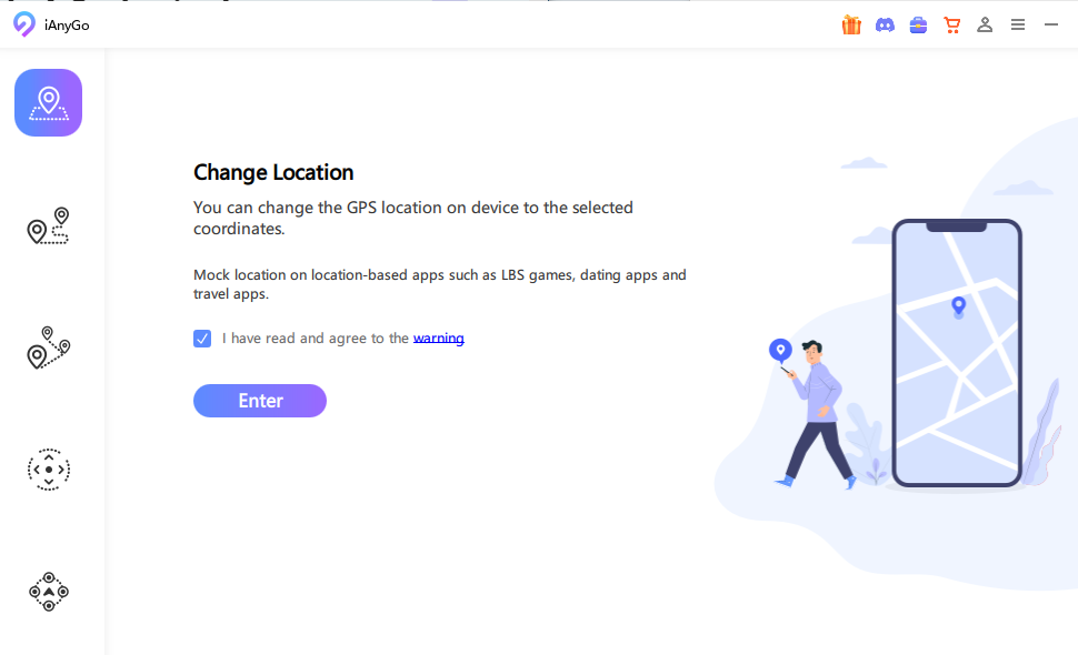 Step 3. Launch iAnyGo after the installation process is completed and Click the Start Button.Select the mode ‘Change Location’.