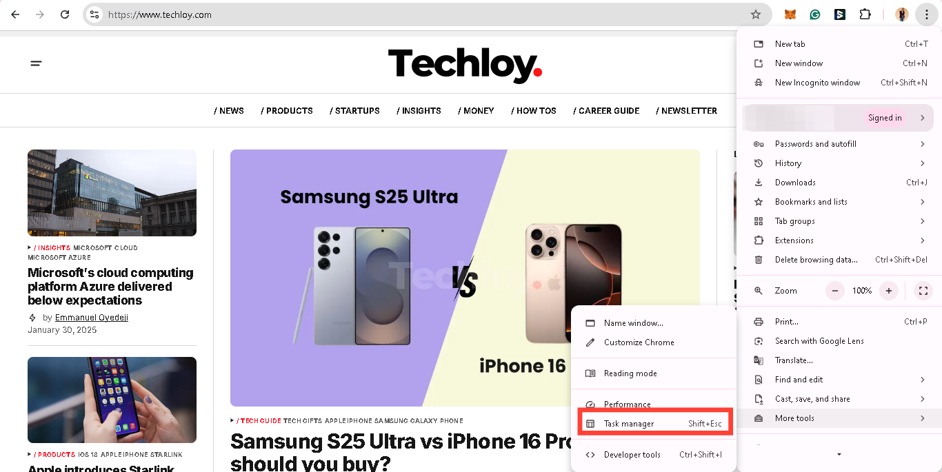 Step 3. From the "More tools" menu, select "Task Manager". This will open Chrome’s Task Manager, where you can see all running processes.