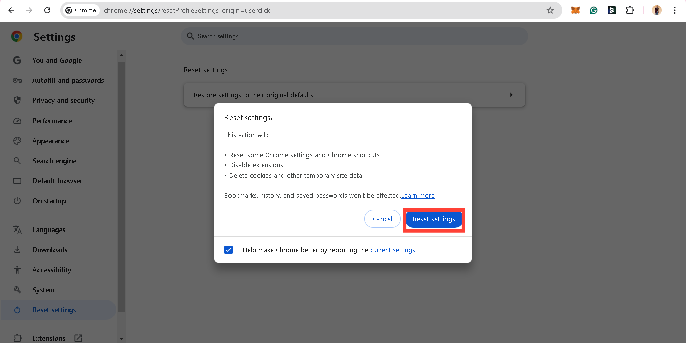 Step 4. A confirmation window will appear. Click "Reset settings" to proceed.