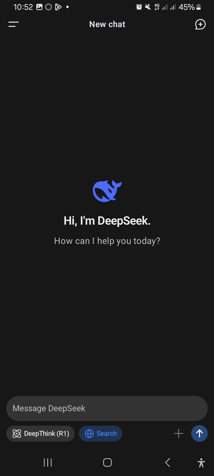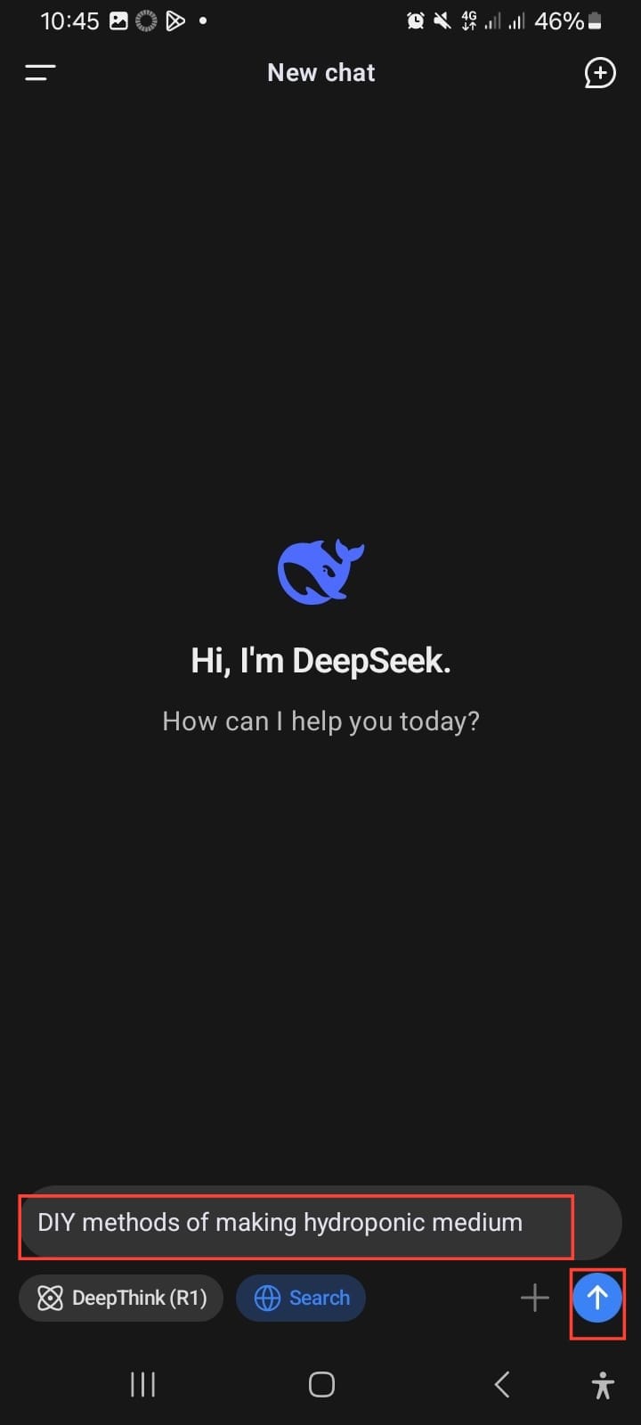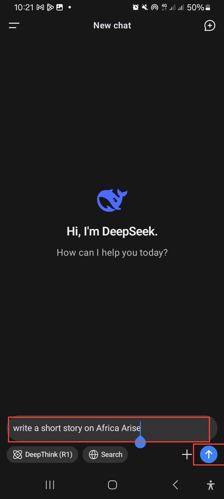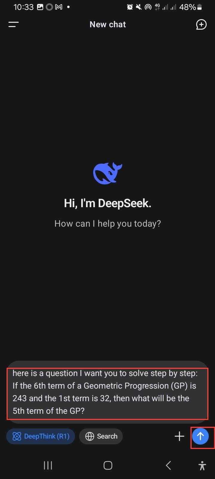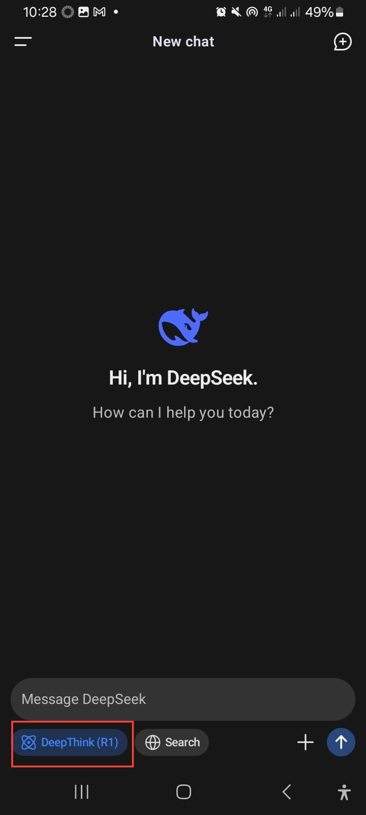 Step 1. On the DeepSeek home screen, tap the "DeepThink(R1)". This will highlight a blue color, indicating the feature has been selected.
