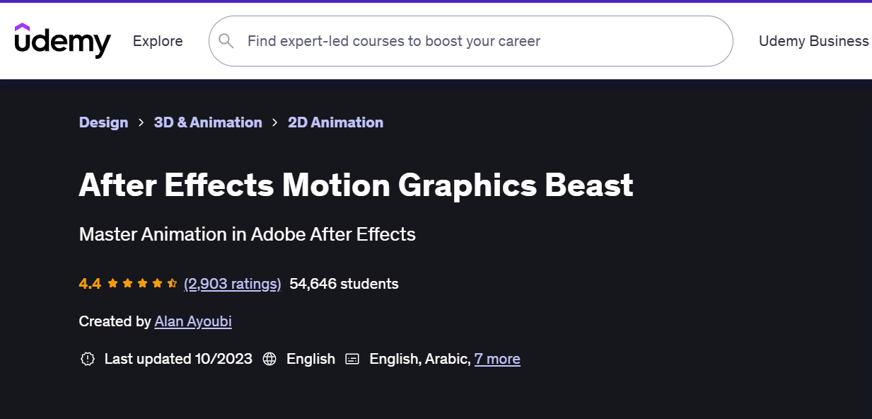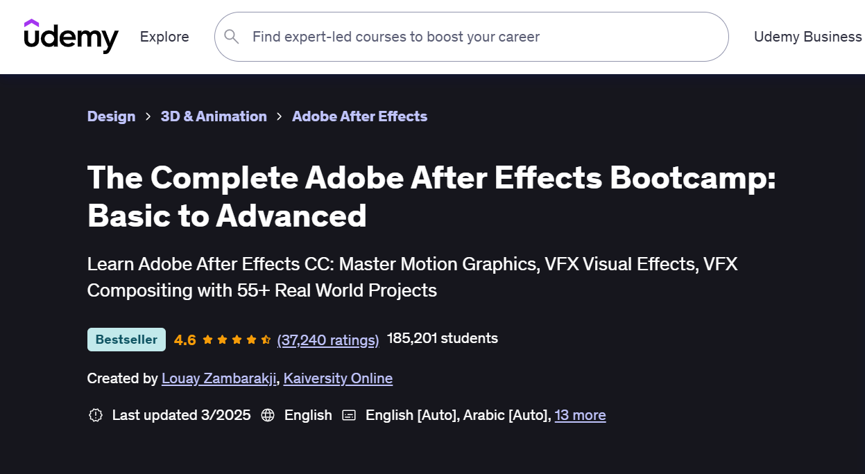 This 35-hour course is a deep dive into Adobe After Effects, designed to take you from absolute beginner to confident motion designer. You’ll create over 50 real projects—from animated infographics and typography to VFX and 3D camera animations. The course also teaches essential techniques like motion tracking, rotoscoping, and compositing.