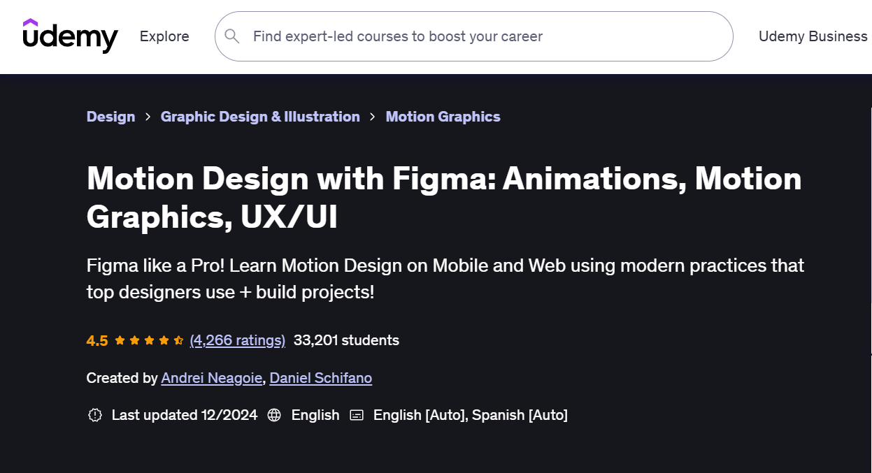 If you’re leaning toward UI/UX or app design, this course blends Figma with motion graphics to show you how to create dynamic design prototypes. You’ll build real projects like mobile apps, carousels, and landing pages, while learning Smart Animate and motion design principles that are trending in today’s design space.