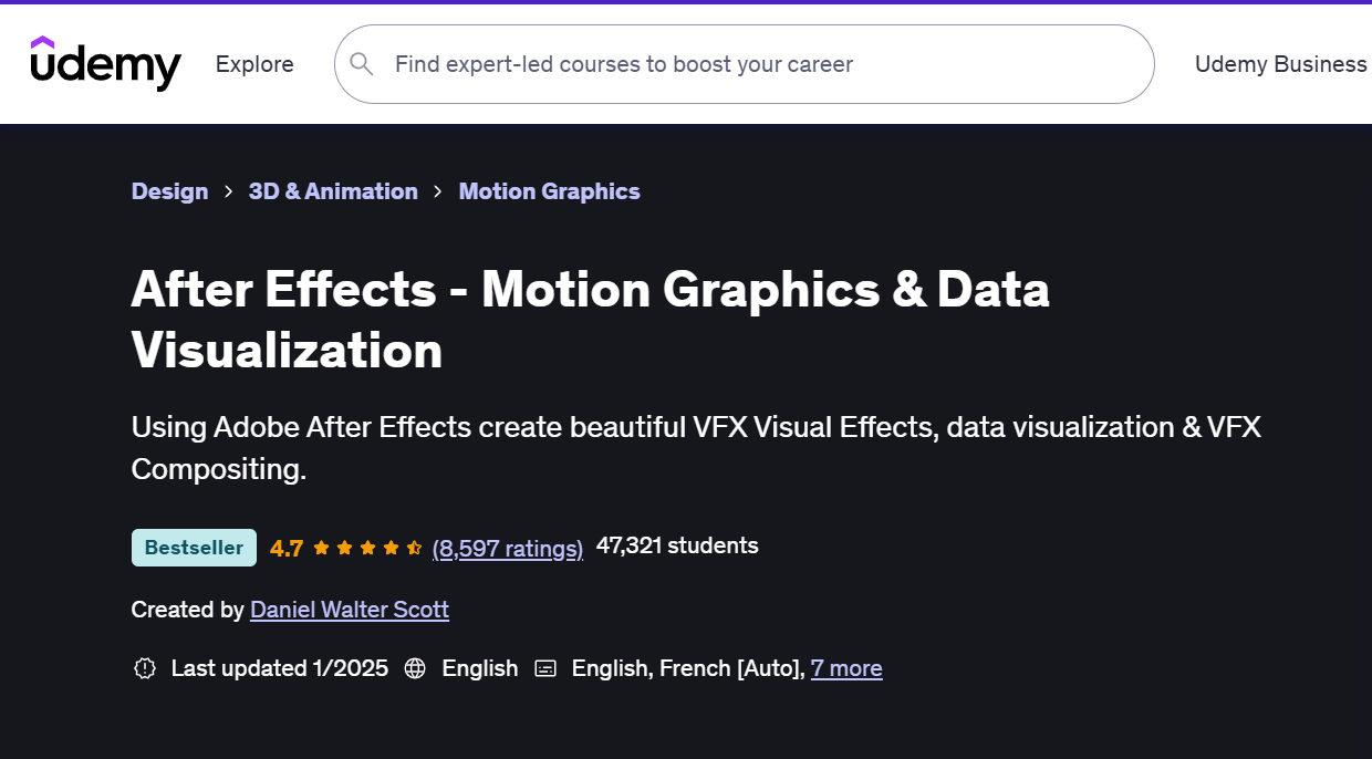 This course is perfect if you’re into data and storytelling. It teaches you how to bring spreadsheets to life with animated charts, graphs, and infographics using After Effects. It also covers exporting animations for YouTube, social media, and even PowerPoint.