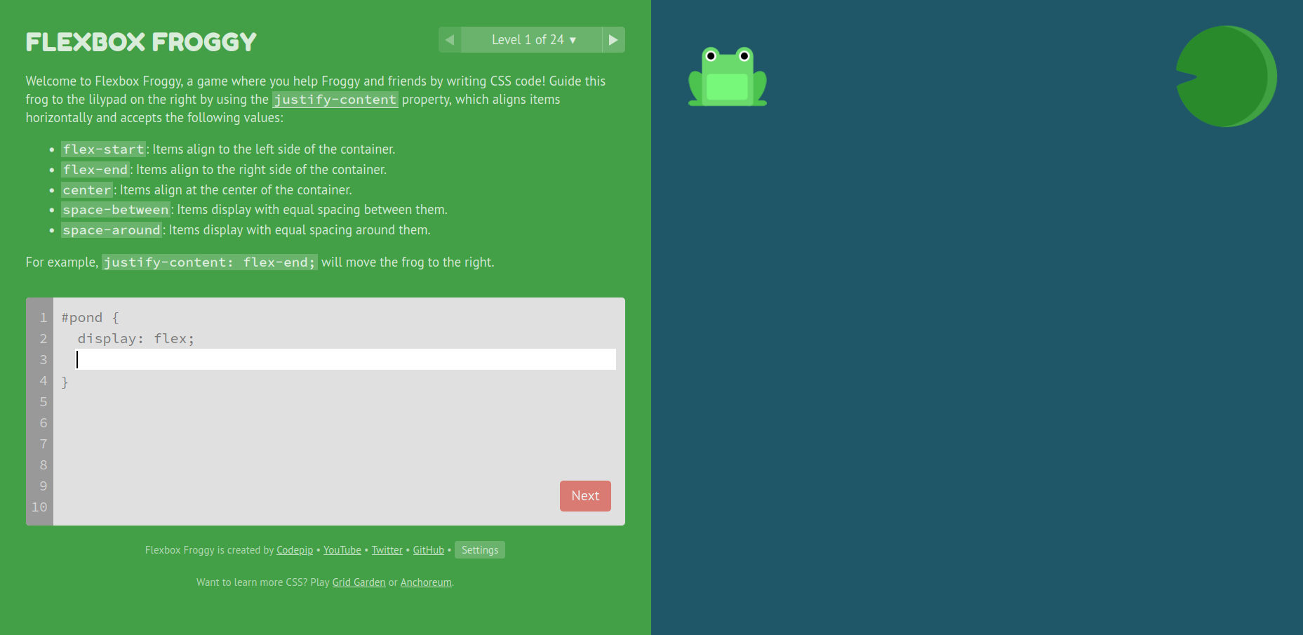 Flexbox is essential for creating flexible, one-dimensional layouts. Flexbox is essential for creating dynamic, one-dimensional layouts—perfect for navigation bars, card grids, and centering elements. This game teaches core properties like “justify-content”, “align-items”, and “flex-direction” through 24 frog-moving challenges.
