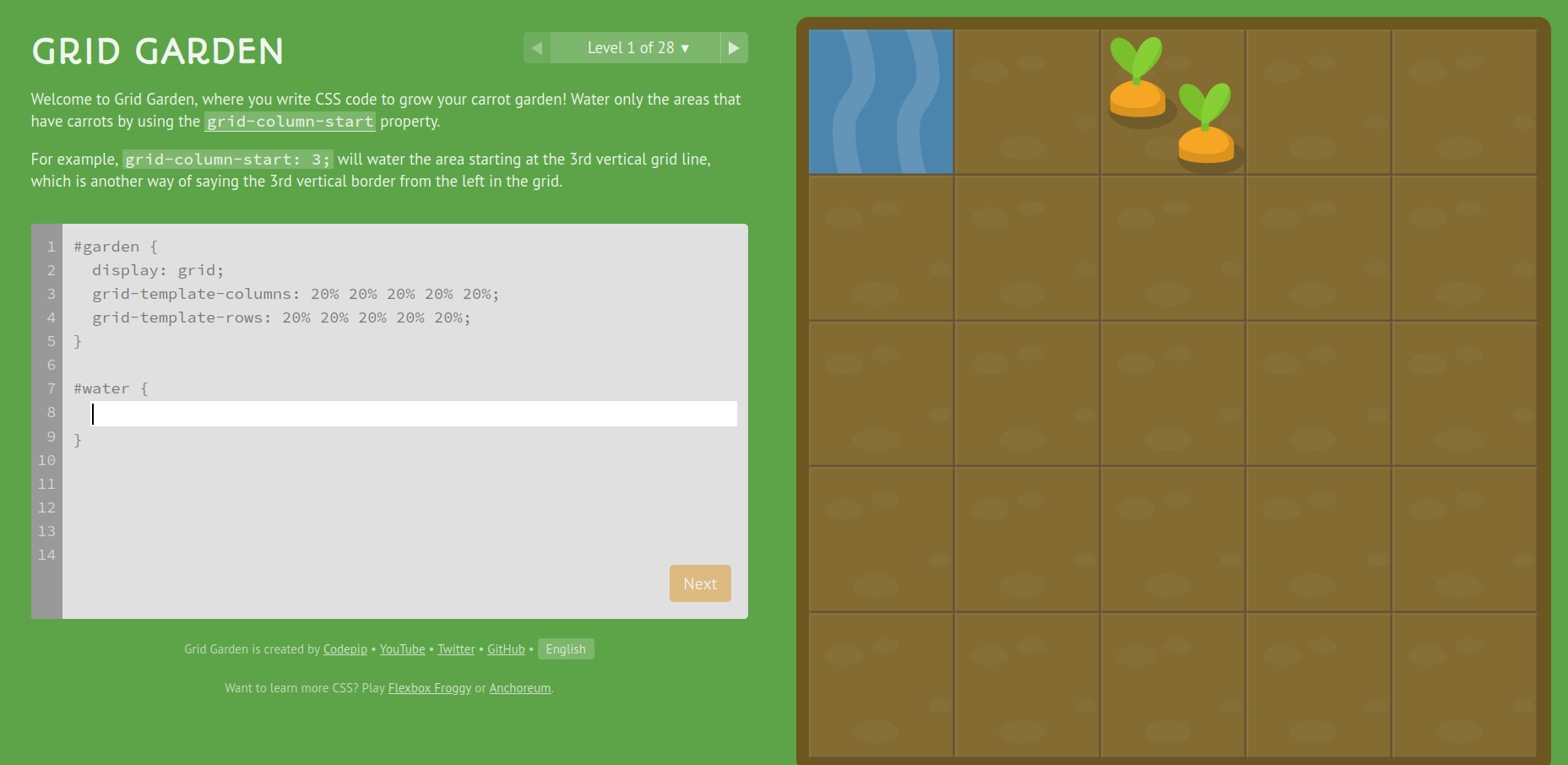 How it works: You water carrots and poison weeds by placing them in grid cells using CSS. The game reinforces how Grid’s line-based positioning works.