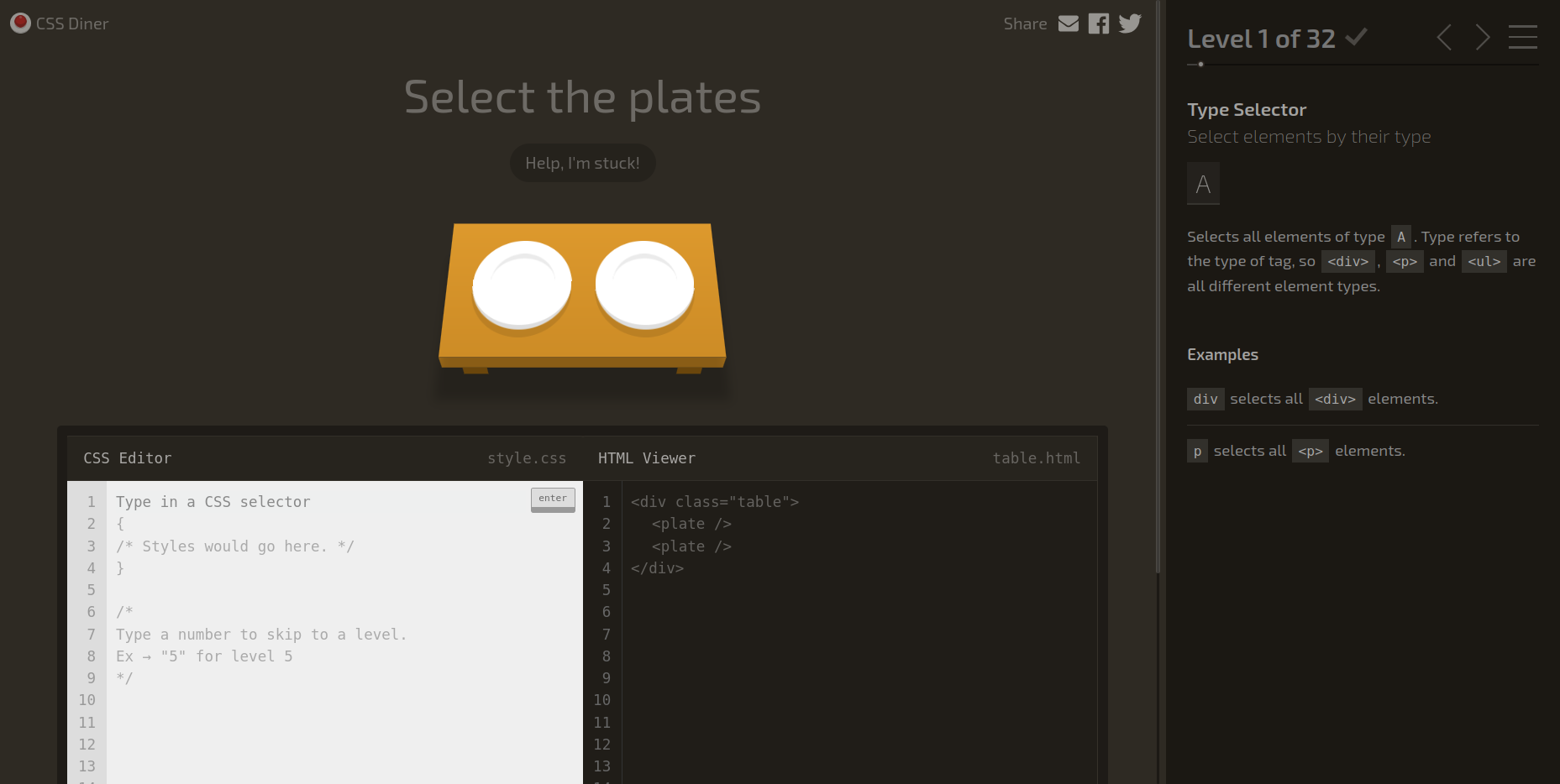 How it works: You "select" plates and utensils in a diner using CSS syntax, progressing from simple tag selectors to complex combinators like:nth-child() and [attribute^="value"].