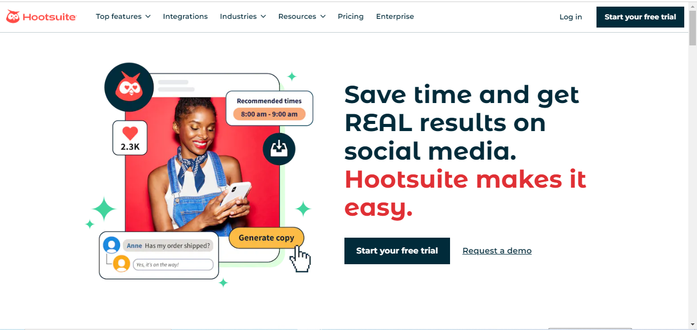 By linking your social media accounts to Hootsuite, you can manage them all from one location instead of on each platform separately. This facilitates and expedites sharing and scheduling material on social media platforms, replying to and interacting with your followers, and collaborating with groups to oversee several accounts.