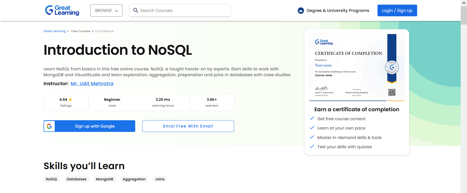This course introduces you to the world of non-relational databases. If you use JavaScript (Node), you've probably heard of the MERN stack. MERN stack developers use MongoDB, a non-relational database. The type of database to be used is dependent on the project requirement, thus, you should know the fundamentals of both types of databases so you can easily work with any project demands. This course will teach you how to connect the database to a server, how to prepare the data, joins operations, and so much more.
