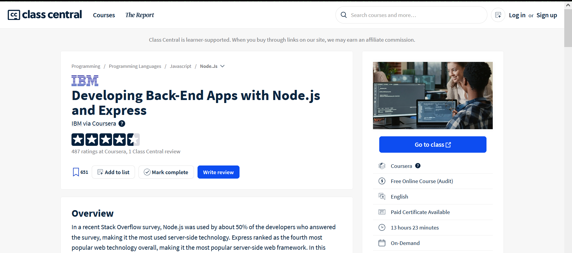Node and Express are popular JavaScript frameworks for working with the server side. If you're using JavaScript for the backend, this course will be great for you. This IBM course will teach you how to develop backend applications, make CRUD operations, and implement authentication and session management. To get started in the course, you need to have a foundational background in JavaScript.