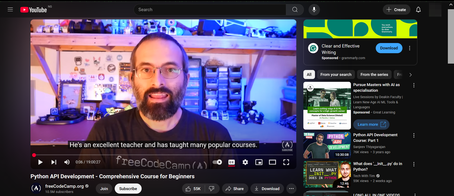 This 19-hour YouTube course is a personal favourite. If you use Python for backend development, you'll come to realize FastAPI is the best Python framework for building APIs. Because it uses the Asynchronous Server Gateway Interface, it is the fastest and most preferable library for building APIs in Python. This course is comprehensive without a doubt, it goes beyond just introducing you to FastAPI, it teaches you every fundamental principle about APIs, down to testing and deployment. If you want to build perfect APIs in Python and any language even, I'd recommend taking this course.