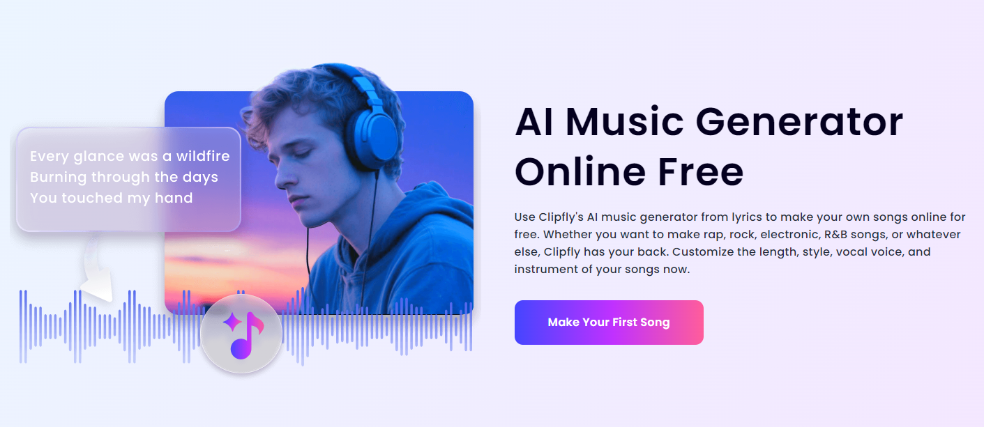 AI music tools convert lyrics or short text ideas into structured songs. The AI music generator of Clipfly is a tool that can immediately convert your text or lyrics into a song. Only type in a few lines of lyrics and select a genre/mood; the system can then compose vocals and instrumentation for that selected genre/mood. This is an in-built music composer that analyses millions of already existing melodies to come up with tracks that sound like natural compositions.