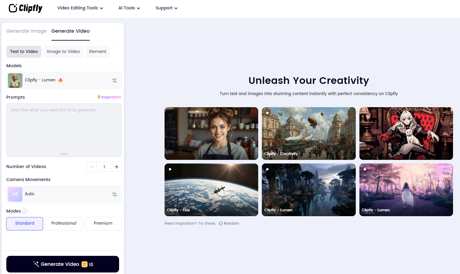 AI video generators map a prompt (text or image) to a short animated sequence. Most tools offer a browser-based editor so you can refine output. The AI video generator provided by Clipfly can create videos with high-quality and sharp images (free up to 1080p, Pro up to 2K/4K) that move in a smooth and life-like manner. It is a tool that allows you to just explain a scenario or a scene in words, and it generates a video clip within seconds. All is in the browser: once you have generated it, you can edit, add captions, or voiceovers in the built-in editor.