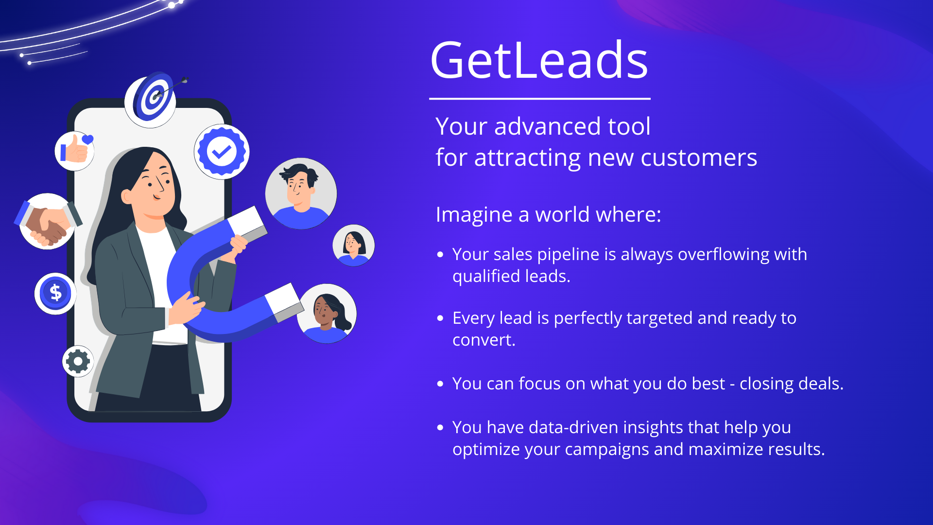 - Staying ahead of trends: GetLeads analyzes your competitors and helps you be one step ahead. Define the perfect lead's profile, identify their gaps and opportunities to attract audiences to you, and generate a complete ad campaign based on the data.