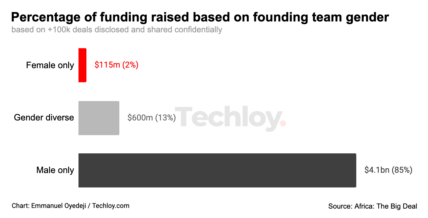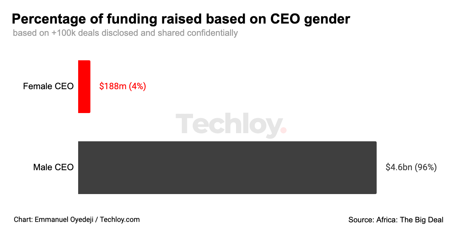 In relative numbers, female-led ventures could only rally a 4%($188m) share of the total volume, while the male-led counterpart copped 96% ($4.6bn). In other words, investment in male-led ventures was 25x times more than funding that was invested in female-led start-ups in 2022.