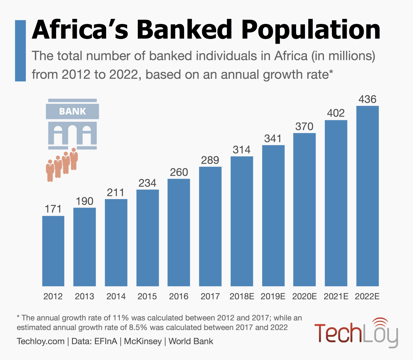 By 2022, it is estimated that there would be 436 million banked Africans, representing about one-third of the continent’s estimated population of 1.4 billion by 2022.