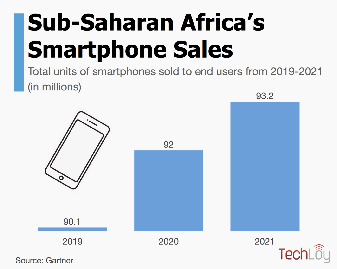 In Sub-Saharan Africa, the total units of smartphones sold to end users reached 90.1 million in 2019 and are expected to hit 92 million by year-end 2020 and projected to reach 93.2 million by 2021.