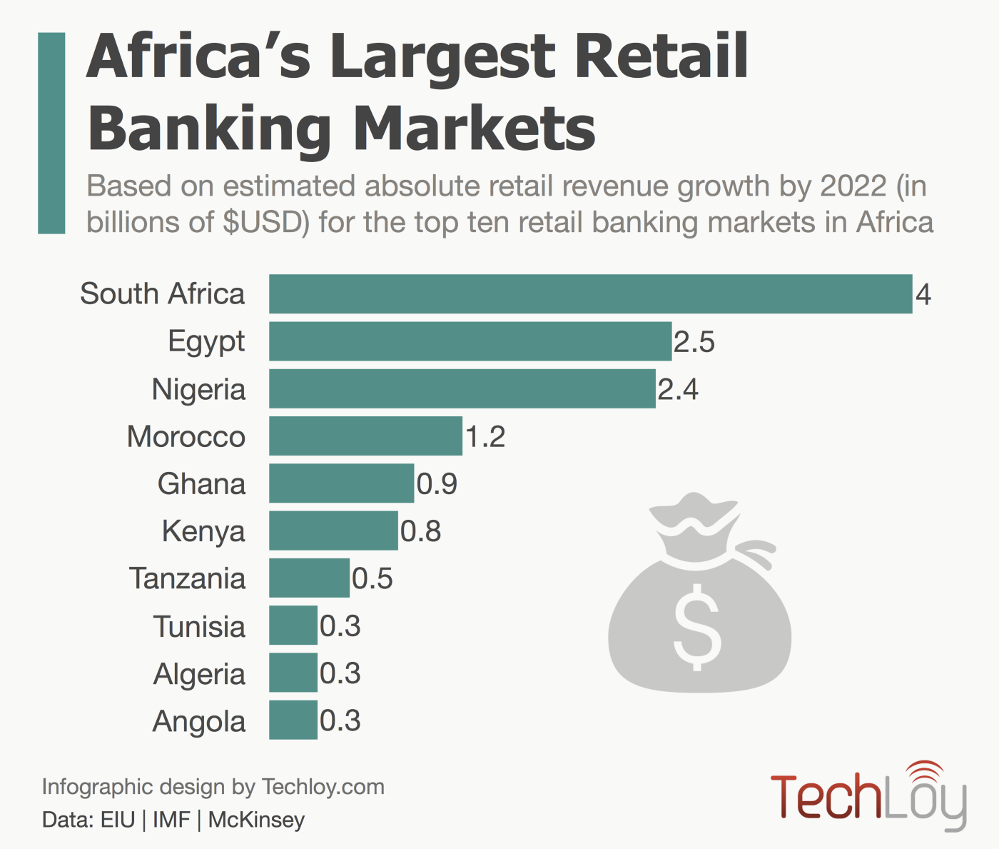 Techloy’s latest infographic highlights the largest retail banking markets in Africa, showing relatively mature markets, such as South Africa, Egypt and Nigeria accounting for 50% of the continent’s total revenue growth up to 2022.