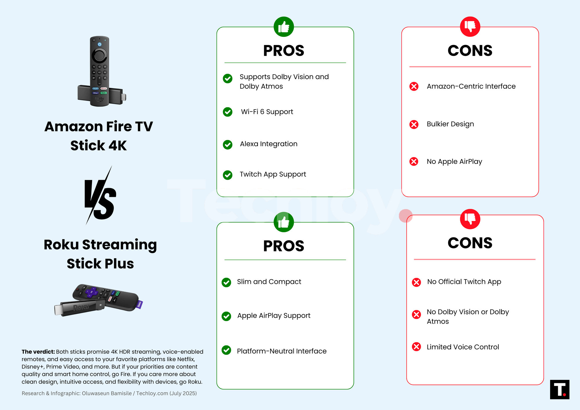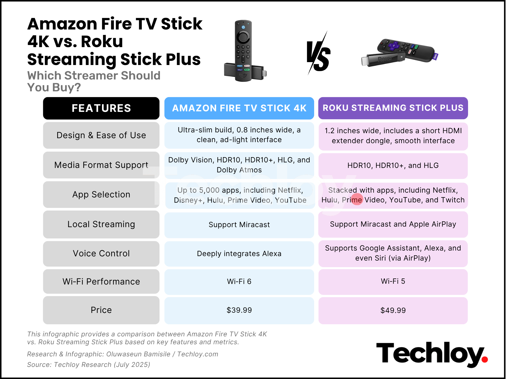 Winner: Roku Streaming Stick Plus. Roku offers broader, more neutral app support and a more transparent content search, though Fire TV gets extra points for Twitch fans.