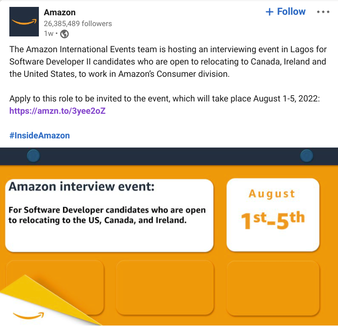 To this end, the Amazon International Events team is hosting an interviewing event in Lagos for Software Developer II candidates who are open to relocating to Canada, Ireland, and the United States, to work in Amazon’s consumer division.