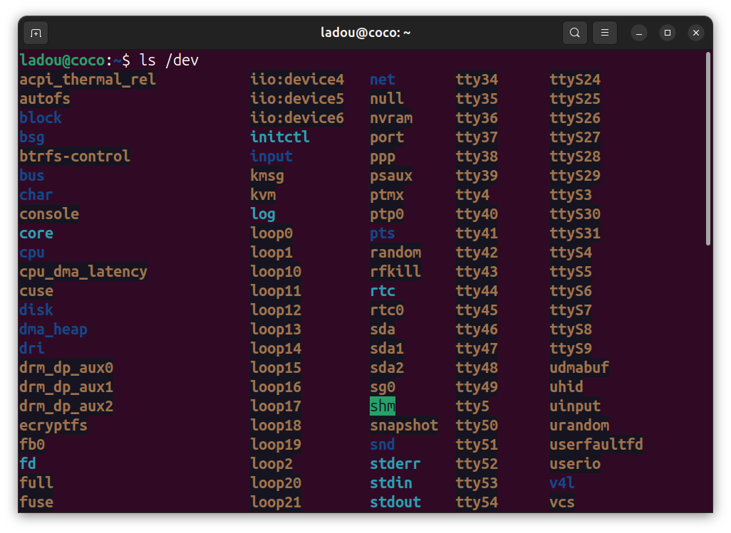 Linux represents every device, from keyboards, disks, even virtual terminals, as files in /dev. For example: /dev/sda (your first hard drive), /dev/null (a "black hole" that discards data), and /dev/random (generates random numbers).