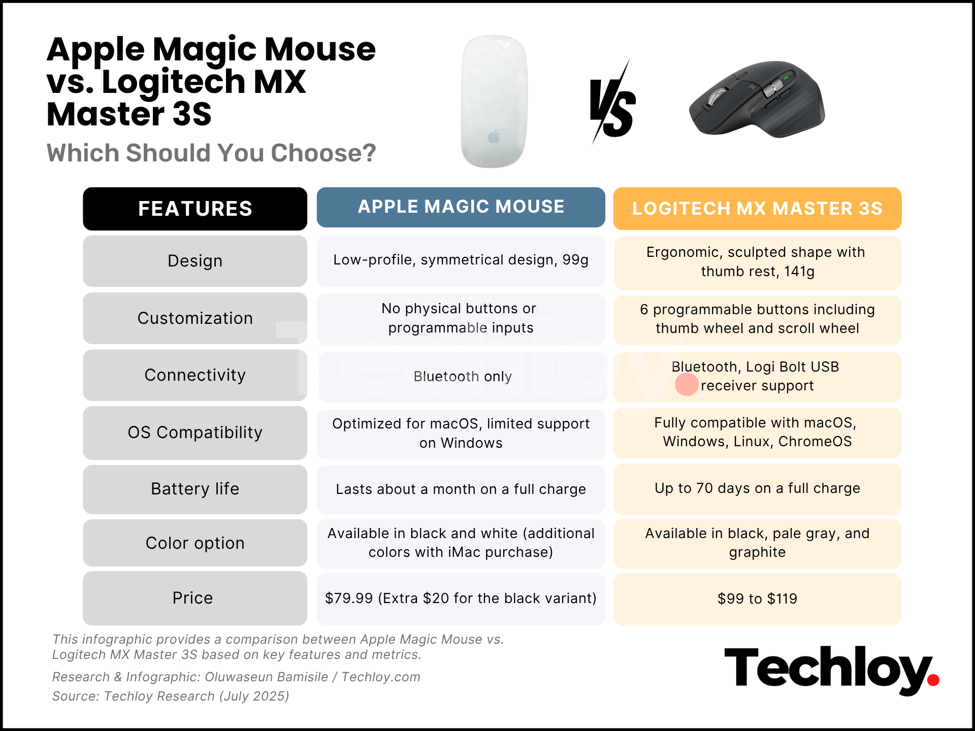 Winner: Logitech MX Master 3S. While the Magic Mouse wins in aesthetic appeal, the MX Master 3S is built for comfort and long hours of work.