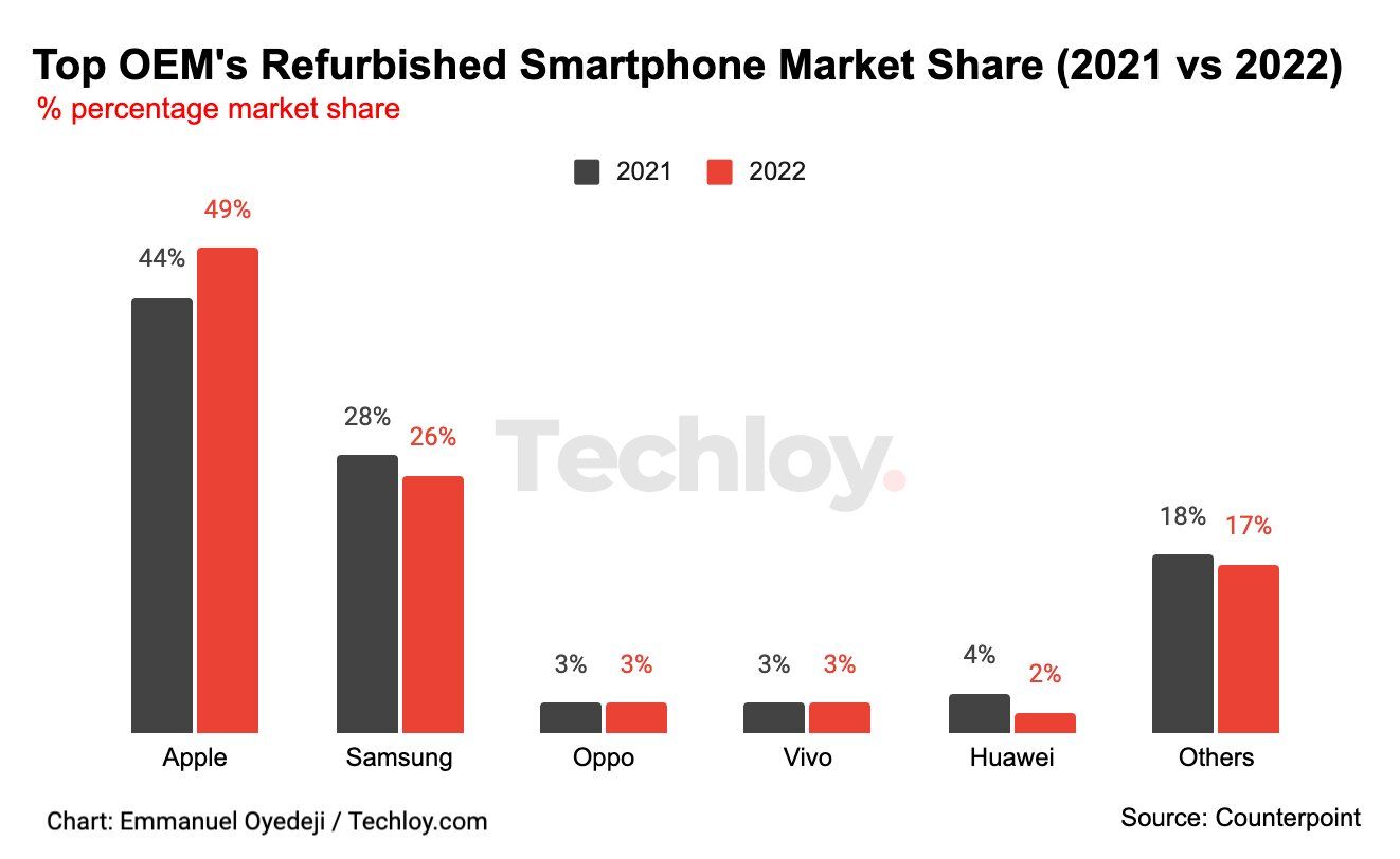 As the Techloy chart below shows, Apple’s iPhones remained the major contributor to the increasing refurbished share due to the brand perception, high margins, and high inventory turnover ratios, growing 16% YoY in 2022, and taking its refurbished market share to over 49%. However, this secondary market demand is affecting new iPhone sales and service revenues in many markets.