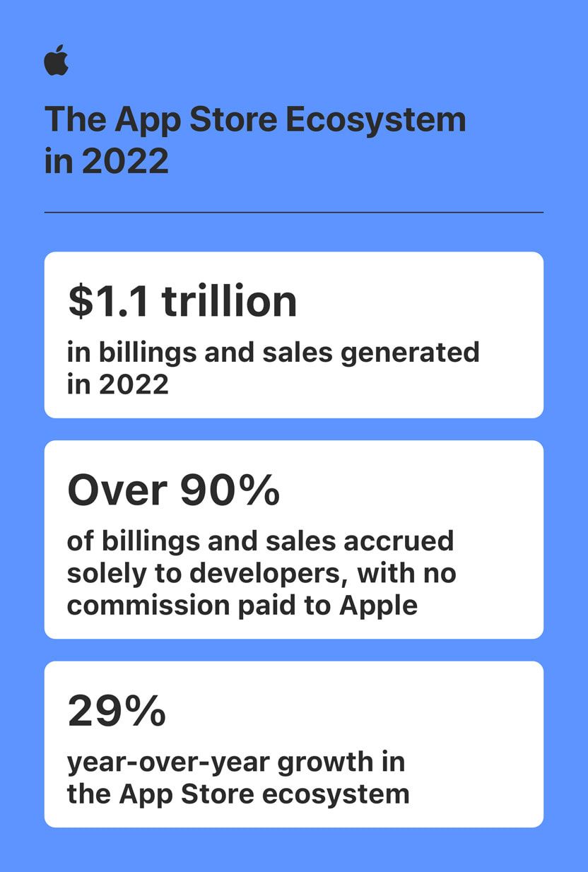 Apple has recorded a significant milestone in its App Store ecosystem which generated $1.1 trillion in total billings and sales in 2022, an estimated 29% growth year-over-year.
