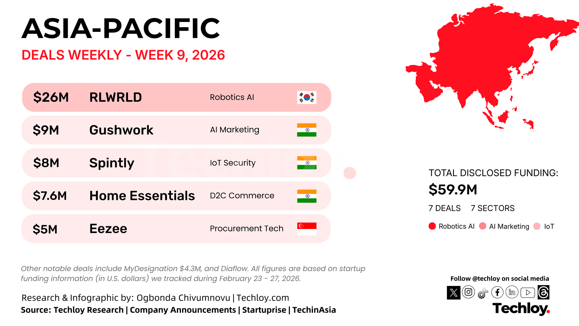 Startups across Asia raised over $59.9 million in disclosed funding this week, with South Korea, India, and Singapore leading deal activity. Capital flowed heavily into AI-driven robotics, construction planning, marketing automation, and smart infrastructure, reflecting sustained investor confidence in applied artificial intelligence across industrial and enterprise use cases.