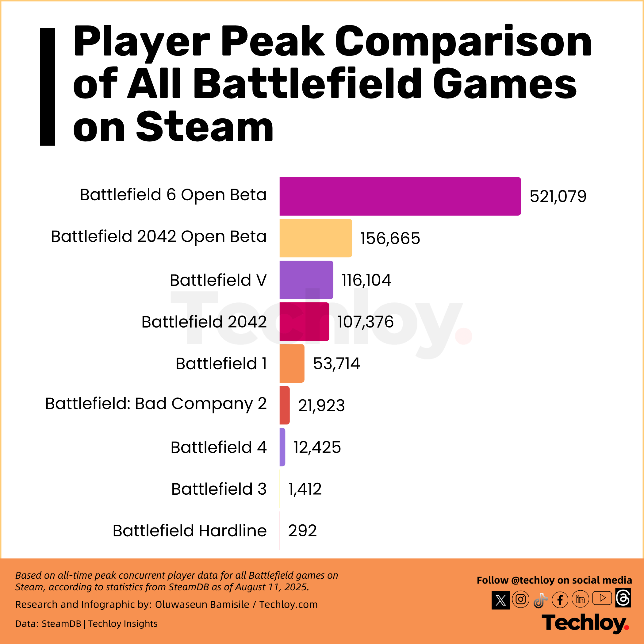 Beyond besting Call of Duty, Battlefield 6's open beta 500k+ concurrent player record becomes the highest the franchise has ever seen on Steam. The franchise's previous record holder, Battlefield 2042 open beta, drew about one-third as many players, peaking at just over 156,000 concurrent users in late 2021.