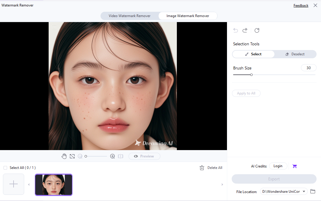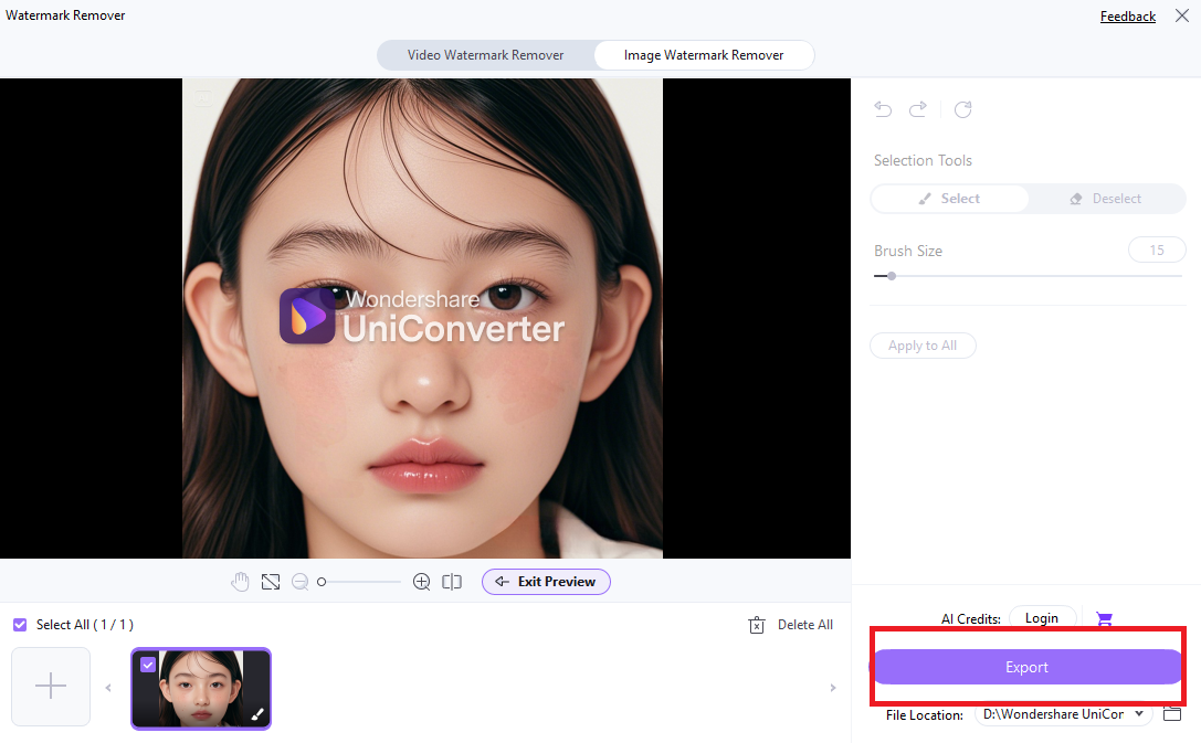 - Open Wondershare UniConverter Watermark Remover and upload the image with visible watermarks or blemishes that you want to remove.