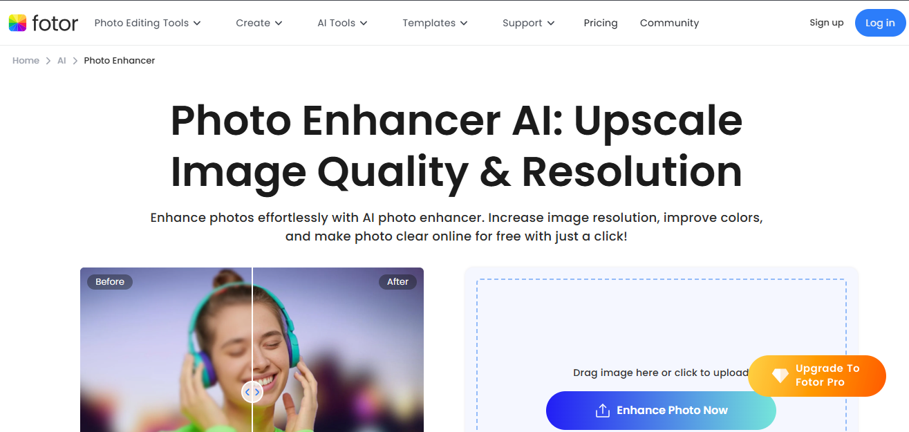 Open Fotor online editor and upload the image you want to edit. You can either drag and drop your photo or select it from your device.