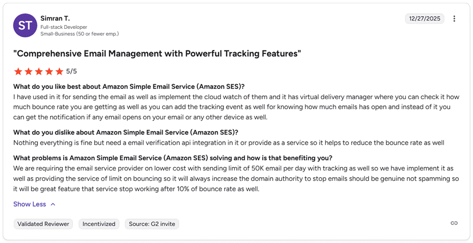 If your stack is deeply embedded in AWS and cost efficiency is the top priority, Amazon SES offers the lowest per-email pricing. The trade-off is higher setup complexity and more responsibility for monitoring and reputation management.
