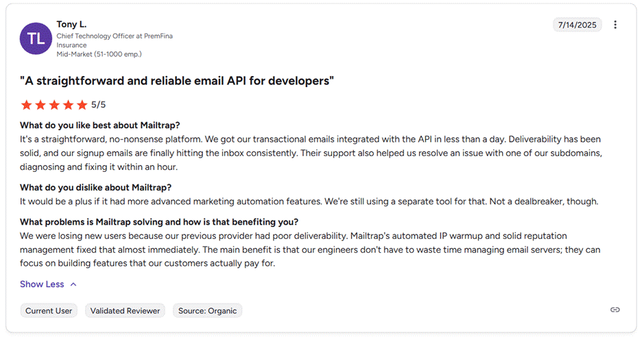 Mailtrap’s API approach removes the need to manage SMTP connections while still offering SMTP as a fallback. For most Node.js teams, this means faster onboarding and fewer production surprises.