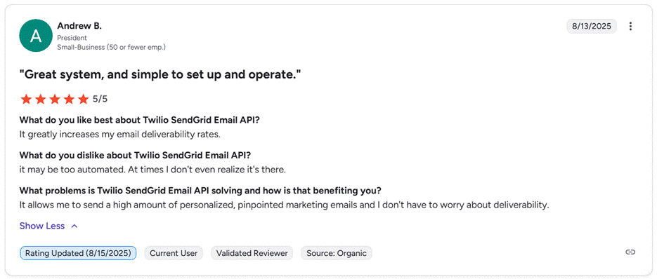 SendGrid is best for enterprises because it combines transactional and marketing capabilities under one platform, with a large ecosystem and mature tooling. It delivers a broad range of features, though setup and configuration can be more complex.