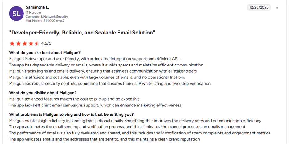 SendGrid is a strong alternative for enterprise teams that need to manage both transactional and marketing email from a single platform, while Mailgun is better suited for applications that require advanced API control, routing, or validation workflows.