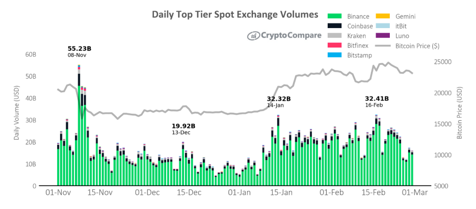 According to market data culled by Coindesk from CryptoCompare, the crypto exchange firm registered an increase in market share from 59.4% in January to 61.8% in February and an increase of 7% since the collapse of FTX in November.