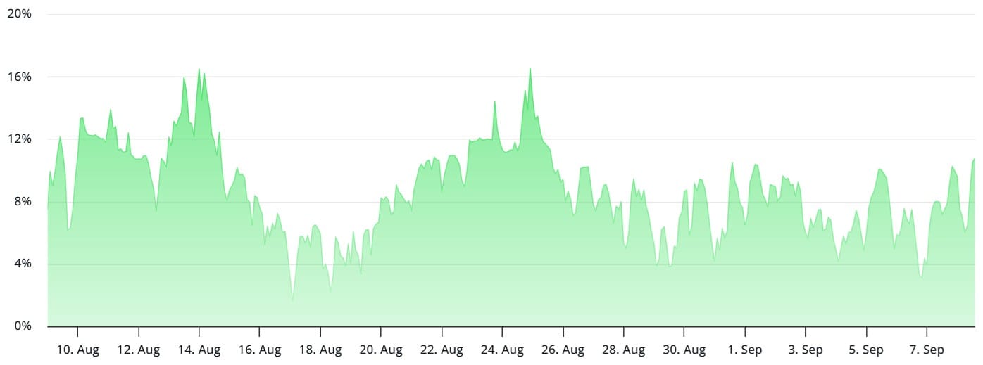 But the real story here and the reason traders are still hesitant is what’s happening with ETF flows. Between Thursday and Friday, spot Bitcoin ETFs recorded $383 million in outflows. For context, ETF flows have become one of the strongest gauges of institutional sentiment toward BTC. Outflows don’t just signal less demand; they also weigh on price because large-scale selling often follows redemptions. Meanwhile, Ethereum is stealing some of the spotlight. ETH ETFs saw around $200 million in inflows last week, with some companies even adding Ether to their corporate reserves, according to StrategicETHReserve data. That’s a subtle but important shift; capital isn’t leaving crypto altogether, it’s rotating. ETH is starting to look like a serious alternative reserve asset, and institutions are paying attention. Futures data isn’t giving much away either. Funding rates bounced back to 11%, a rebound from the bearish 4% level earlier in the week. which basically means traders are on pause. No one’s leaning bullish or bearish; they’re watching ETF flows and waiting to see whether BTC shakes this off or if ETH keeps eating into its dominance.