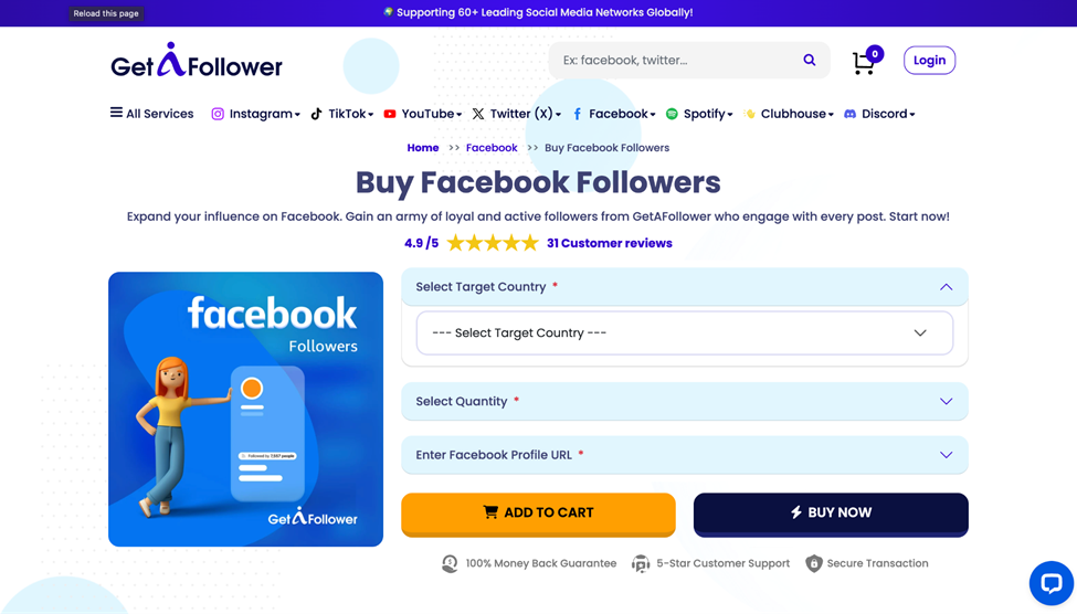 The ordering process asks for your Facebook page URL; no passwords needed. They use SSL encryption and accept credit cards, Digital wallet, and crypto for payment. Customer Support is available via email and live chat. GetAFollower also offers post likes, video views, and page ratings. Their dashboard tracks orders in real time. The gradual delivery looks natural to audiences and Facebook's systems. Campaigns can be customized, and they handle recurring orders. Refund policy covers underdelivery situations.