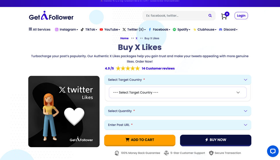 The platform's pricing structure makes it accessible whether you're testing a campaign or scaling something proven. GetAFollower supports all X post types and doesn't require your password at any point. Likes deliver in over days rather than flooding your post all at once. They offer live chat support and real-time delivery tracking. Payment methods include major cards and digital wallets with SSL encryption. With over a decade of experience, they've refined their delivery methods to prioritize account safety and natural engagement patterns.