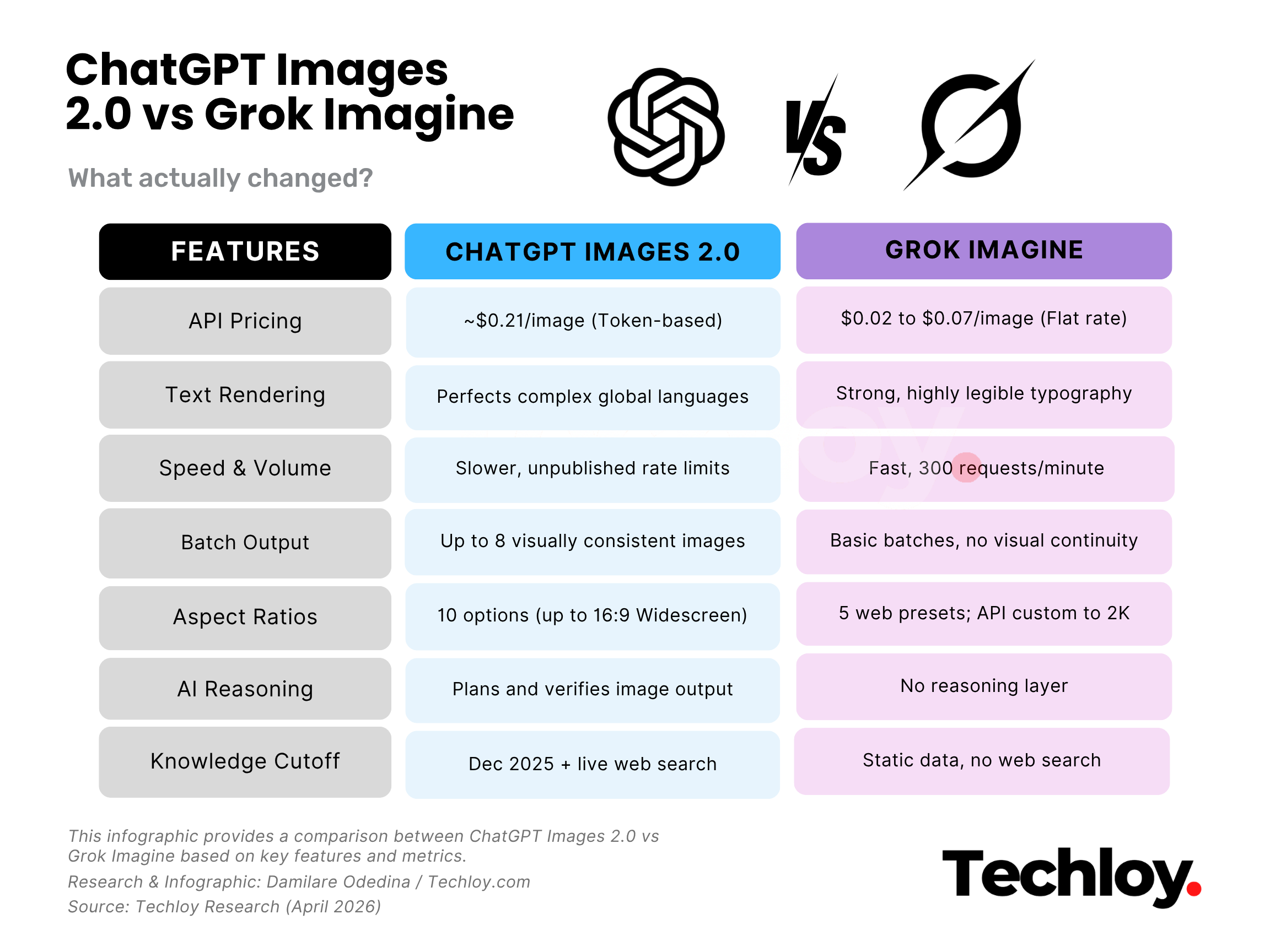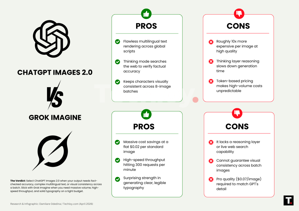 OpenAI launched ChatGPT Images 2.0 on April 21 and it is the first image generator that reasons through what it is making before it makes it. On the other side, xAI’s Grok Imagine 1.0, which saw a massive foundational upgrade in February 2026 has been running at a flat $0.02 per image through its API, roughly one-tenth the price of ChatGPT at full quality.
