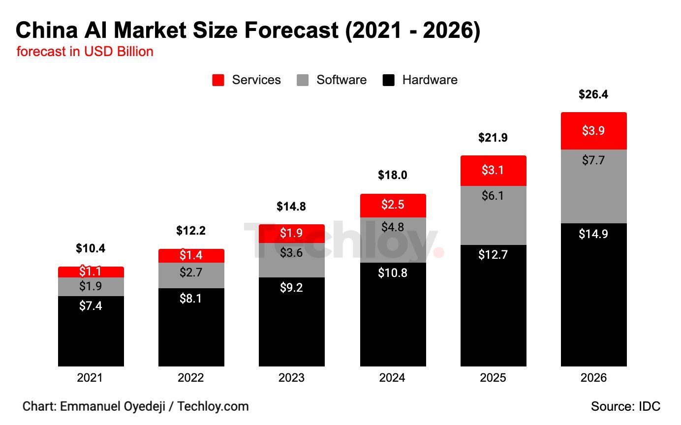 Looking at the Techloy chart below, analysts predict that the hardware segment will maintain its dominance in the China market, capturing a significant 56% share. In contrast, AI services, which encompass AI software solutions, consulting, and other related services, will hold the least share of the market throughout the forecast period leading up to 2026.