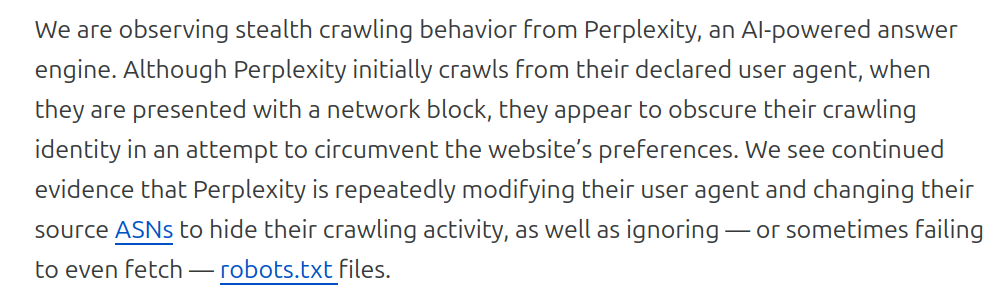 Not more than a month later, Cloudflare publicly accused Perplexity of scraping websites that had not consented to be scraped. According to Cloudflare, Perplexity’s crawler hid behind fake user agents, impersonated Google Chrome, rotated through shadow IP addresses, and accessed content that was explicitly blocked.
