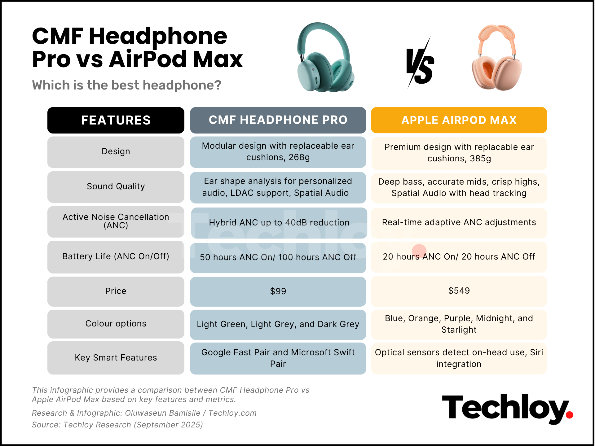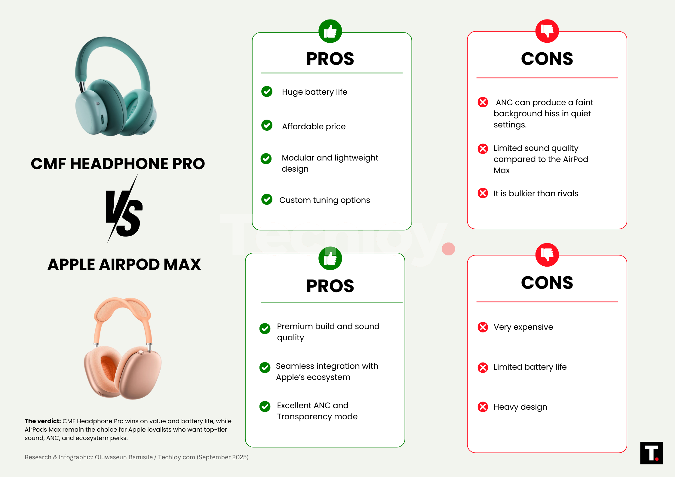 Winner: CMF Headphone Pro: Unless you live fully inside the Apple ecosystem and demand absolute best-in-class sound and ANC, the CMF is the smarter buy for nearly everyone else.