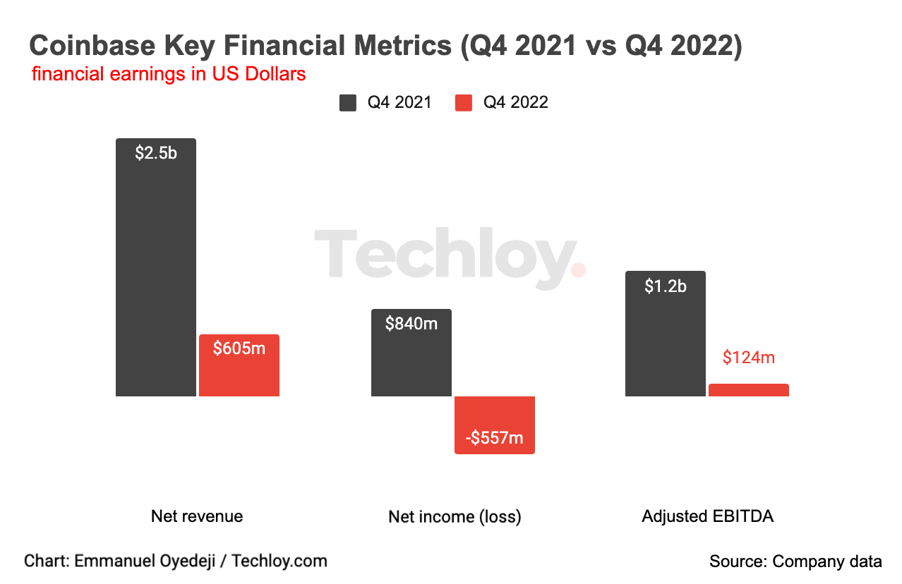The company also reported a (non-adjusted) net loss of $557 million, a year after Coinbase generated a net income of $840 million during the peak of crypto adoption.